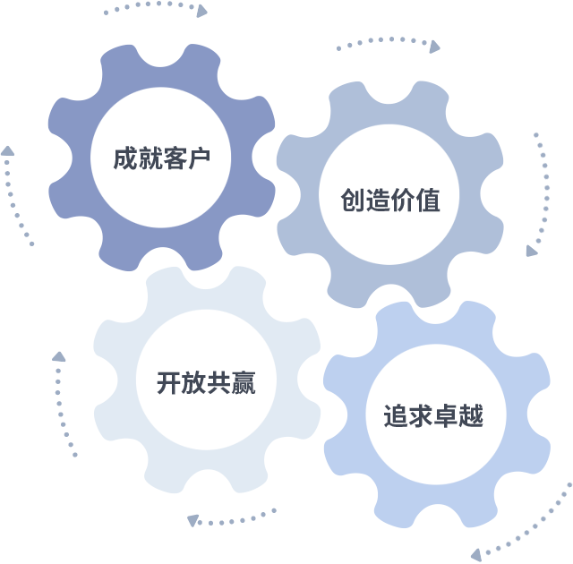 成就客户是一切决策的出发点,创造价值是衡量所有工作的标准,追求卓越是彩神vl做事做人的态度,开放共赢是彩神vl的格局也是最终的结果。价值观的齿轮环环相扣,推动着组织里的每个人不断向前。